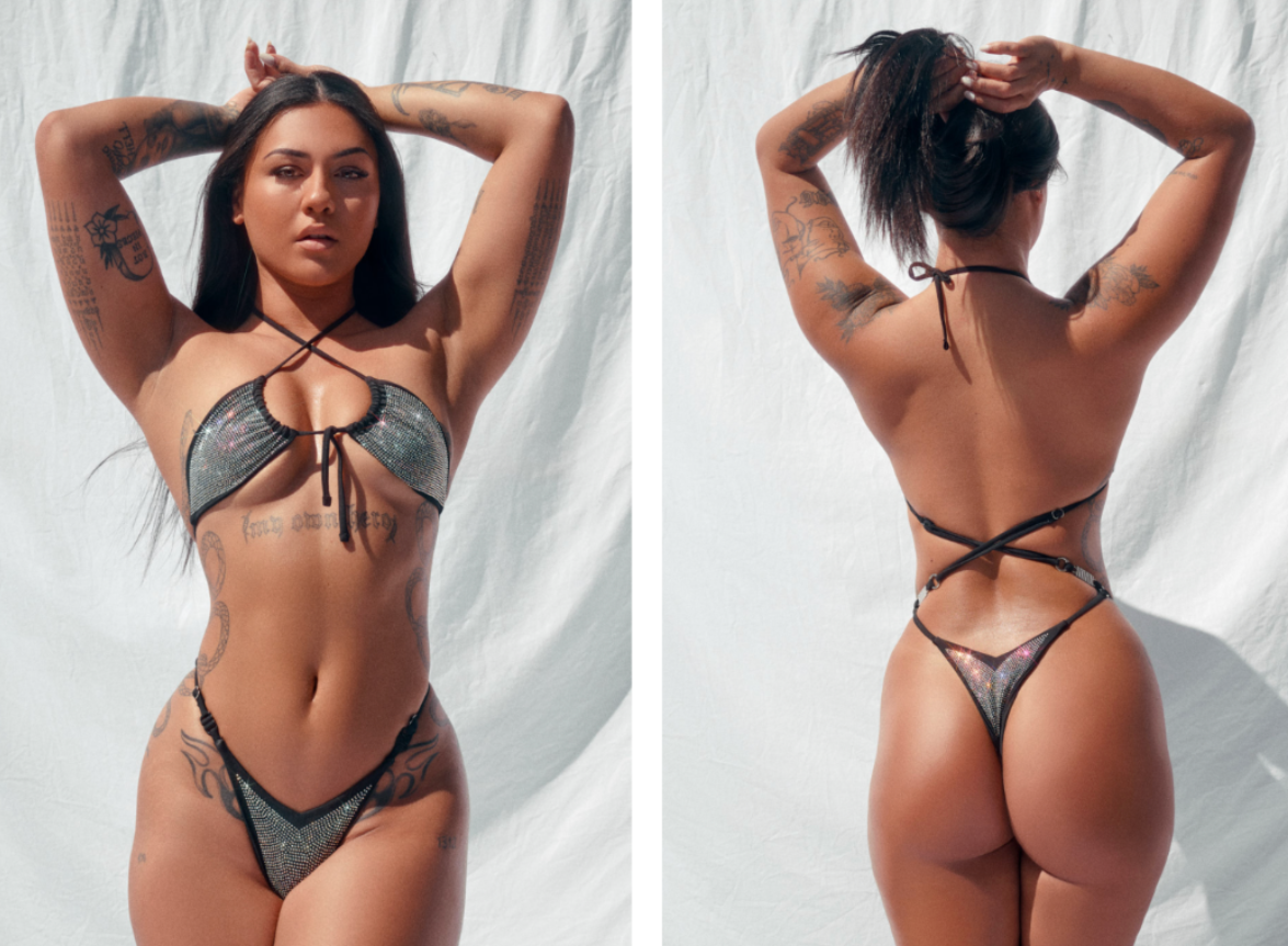 Flipped cups in the front for that cheeky lift and push, with straps crossing at the chest and tying behind the neck
